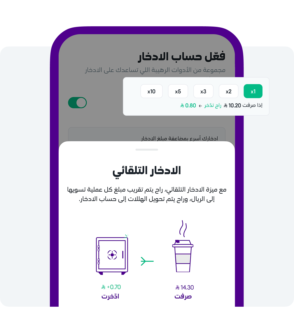 يقوم التوفير التقريبي تلقائيًا بتقريب كل معاملة إلى أقرب ريال سعودي (أو الزيادة اللي تختارها، مثلا: 1 ريال سعودي، 5 ريال سعودي) وتحويل الفرق إلى حسابك الادخاري. بهالطريقة راح توفّر بدون جهد.